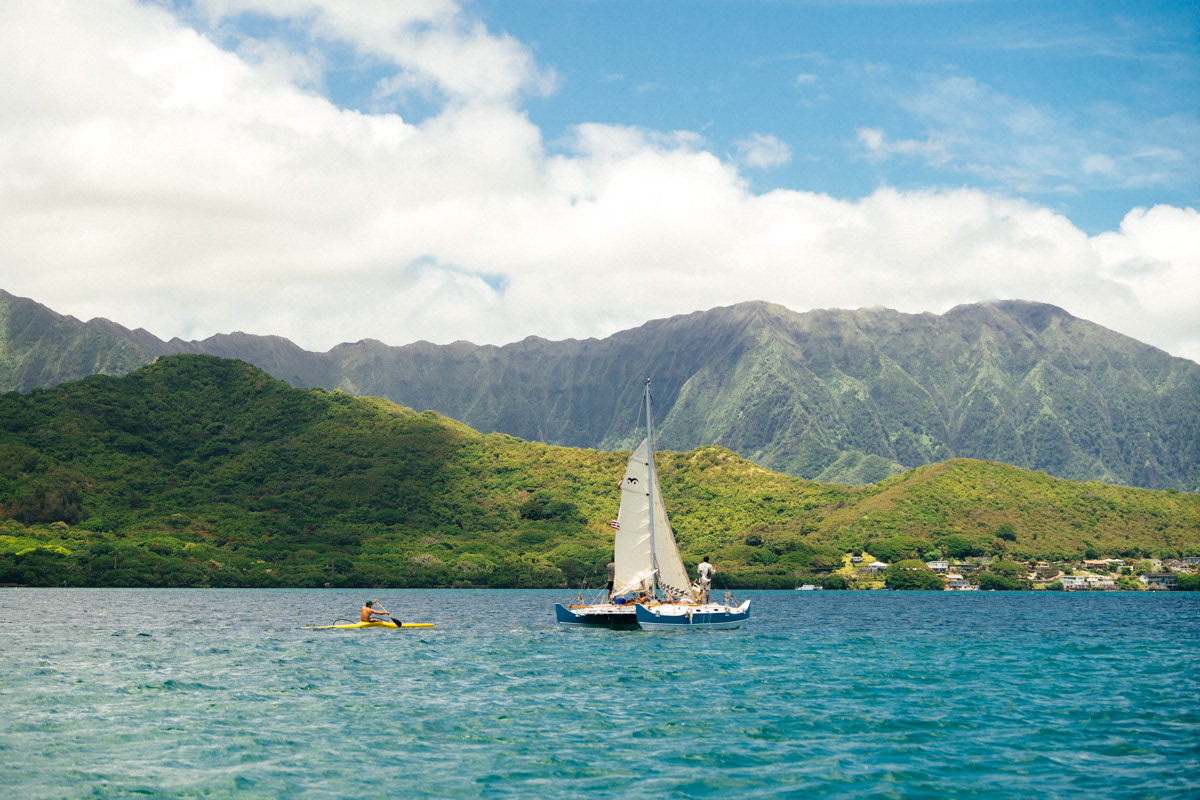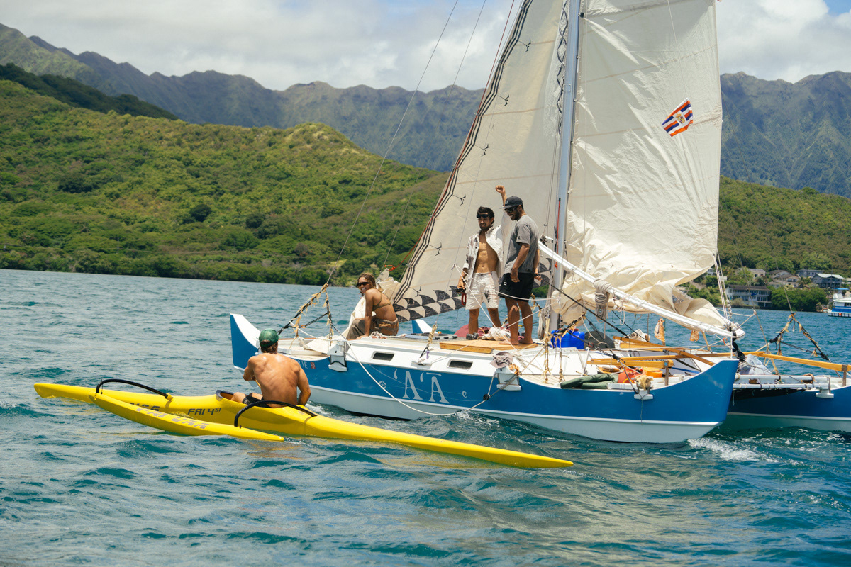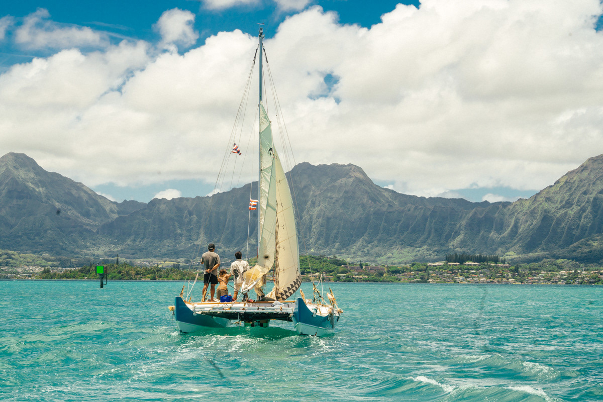 The arrival of Nahokuho'okelewa'a, tiny voyaging haumana, to Kaneohe Bay after 23 days on passage from California. @ethnomads